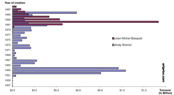 When they started working together in 1984, Andy Warhol was 57 and Jean-Michel Basquiat was 24. Yet in the eyes of the market, the best of their respective productions were already behind them. Our auction data shows that the most sought-after works by Andy Warhol are those created in 1962-1964, and in the case of Jean-Michel Basquiat, the year 1982 is considered his best creative period.