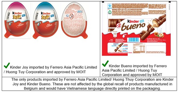 HO CHI MINH CITY, Vietnam, April 22, 2022 /PRNewswire/ — There is a global recall of Kinder products – Kinder Surprise, Kinder Mini Eggs, Kinder Surprise Maxi 100g and Kinder Schokobons – that manufactured in Arlon, Belgium due to reported cases of salmonella in other countries. These products have not been imported into Vietnam by Ferrero Asia Pacific Limited/ Huong Thuy Corporation.