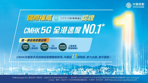 HONG KONG, Dec. 7, 2023 /PRNewswire/ — China Mobile Hong Kong (“CMHK” or “the Company”) has once again raised the bar by sweeping 11 awards (attached) in the latest November 2023 Opensignal Mobile Network Experience Report for Hong Kong, following its remarkable achievement last year in which it won multiple awards in the prestigious Opensignal 5G Global Awards 2022[1]. CMHK successfully maintains its leading position in both 5G download and upload speed, establishing the Company’s unrivaled status as the most awarded 5G network in Hong Kong.