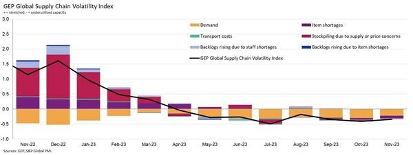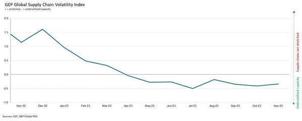 CLARK, N.J., Dec. 14, 2023 /PRNewswire/ — The GEP Global Supply Chain Volatility Index — a leading indicator tracking demand conditions, shortages, transportation costs, inventories and backlogs based on a monthly survey of 27,000 businesses — was once again in negative territory at -0.34 in November, compared to -0.41 in October, indicating an eighth successive month of spare capacity across global supply chains.