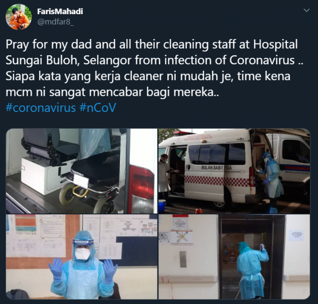 “Pray for my dad and all the cleaning staff at Hospital Sungai Buloh, Selangor from infection of coronavirus .. Who says that a cleaner’s work is so easy, this time it is very challenging for them .. # coronavirus #nCoV
