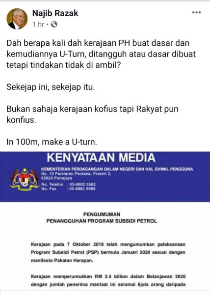 However, the government’s U-turn did not escape former prime minister Datuk Seri Najib Tun Razak’s eye.