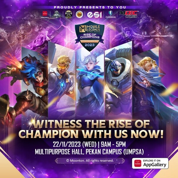 KUALA LUMPUR, Malaysia, Nov. 18, 2023 /PRNewswire/ — HUAWEI AppGallery is pleased to announce its first-ever collaboration with an educational institution to host an E-sports tournament titled “Mobile Legends Bang Bang: Rise of Champions Tournament 2023″ (MLBB: ROCT 2023). The MLBB: ROCT 2023 is a joint initiative between HUAWEI AppGallery and the Faculty of Computing (FK) at Universiti Malaysia Pahang Al-Sultan Abdullah (UMPSA), with support from Kementerian Belia & Sukan (KBS), Esports Integrated (ESI), Malaysia Digital Economy Corporation (MDEC) and Esports Pahang. The purpose of hosting this tournament is to promote E-sports among students at Higher Learning Institution (IPT) in Malaysia as it has become popular in the community nowadays. Apart from that, AppGallery has assisted in the rise of E-sports in Malaysia following the government’s initiative to promote Malaysia as a hub for the E-sports industry.