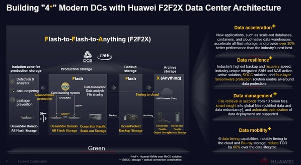 Huawei’s F2F2X architecture provides all-flash primary and backup storage and diversified archive storage. This architecture is designed to efficiently unleash the potential of data and activate the potential of “4+” (Data acceleration+, Data resilience+, Data mobility+, Data management+) data centers.
