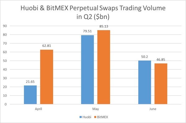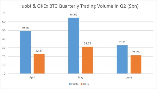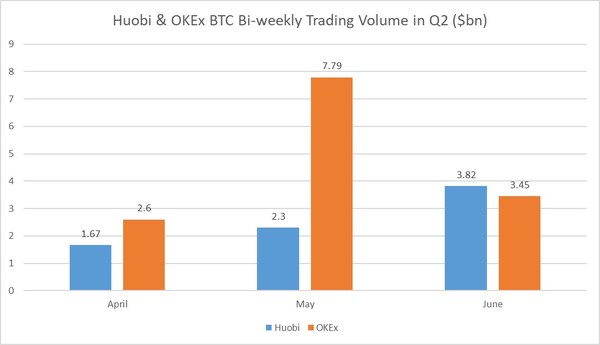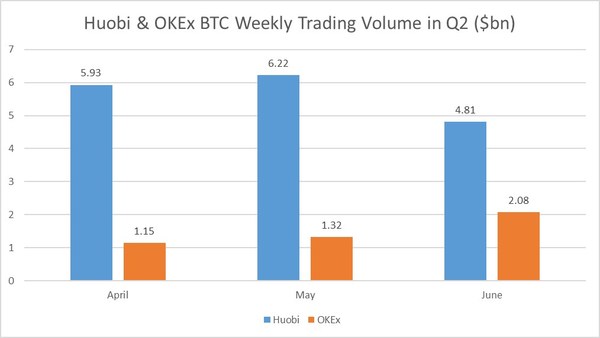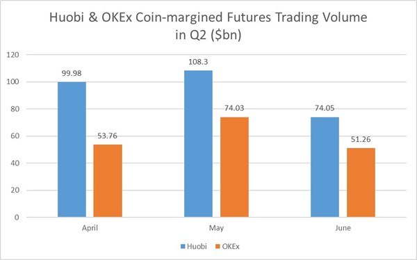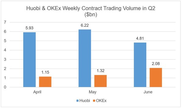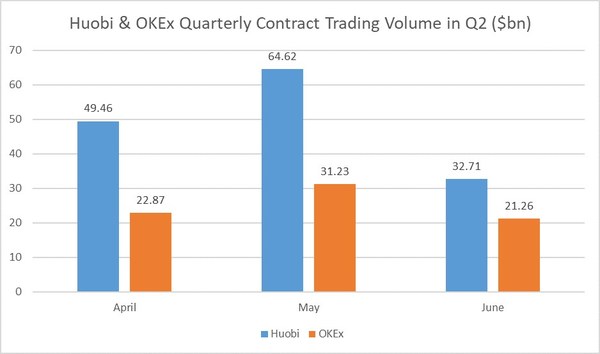 Huobi has far outperformed OKEx in BTC Weekly contracts trading in Q1 as through April, May and June Huobi more than doubled the trading volume against its competitor.