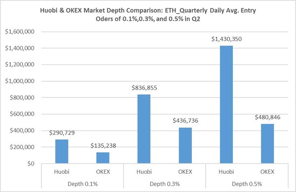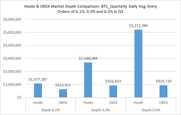 Market depth considers the overall level and breadth of open orders and is calculated from the number of buy and sell orders at various price levels on each side of the mid-price. Let’s take Quarterly contract as an example, as we can see from below charts, the performance of Huobi’s market depth is much better than OKEx for both TOP 2 token BTC and ETH.