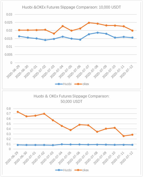 Slippage can occur at any time but is most prevalent during periods of higher volatility when market orders are used. Huobi has shown it has some of the lowest slippage rates, and this can be seen in comparison to OKEx in regards to 10,000 UDT and 50,000 USDT.