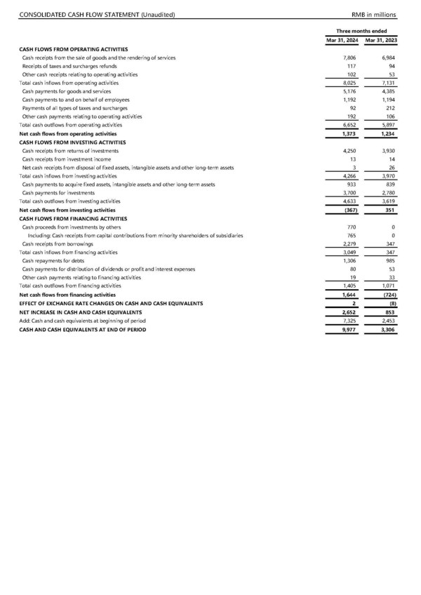 - Generated RMB 1.37 billion cash from operations. With net capex investments of RMB 0.93 billion, free cash flow for the quarter was RMB 0.44 billion.