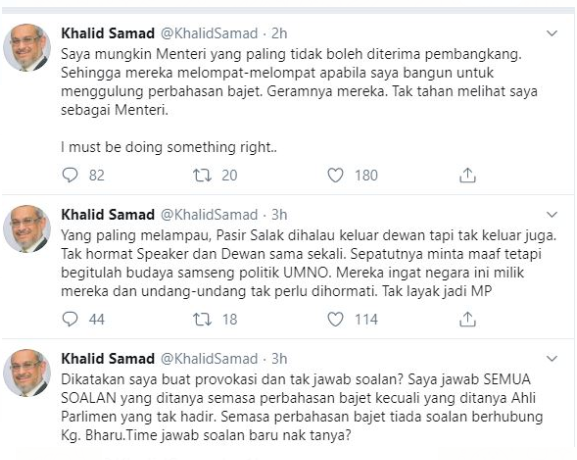 In a series of tweets, Khalid pointed out to the unruly behaviour of Umno lawmakers, particularly Pasir Salak MP Datuk Seri Tajuddin Abdul Rahman, who caused a ruckus at the Dewan Rakyat sitting yesterday.