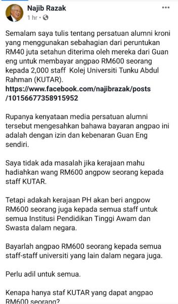 In a Facebook post, Najib said he should be fair to all IPTA staff, as Lim was reported to have given green light for Tunku Abdul Rahman University College (KUTAR) staffs to be given RM600 ang paw for the Lunar New Year.