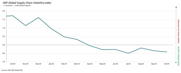 CLARK, N.J., Nov. 16, 2023 /PRNewswire/ — The GEP Global Supply Chain Volatility Index — a leading indicator tracking demand conditions, shortages, transportation costs, inventories and backlogs based on a monthly survey of 27,000 businesses — decreased again in October to -0.41, from -0.35 in September, indicating a 7th successive month of rising spare capacity across the world’s supply chains. Additionally, the extent to which supplier capacity went underutilized was even greater than in September and August. Coupled with October’s downturn in demand for raw materials, components and commodities, this shows rising slack in global supply chains.