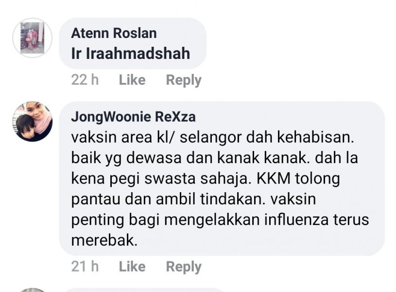 KUALA LUMPUR: Residents around Kuala Lumpur and Petaling Jaya areas took their frustrations to social media, claiming there was an acute shortage of influenza vaccine in healthcare facilities.