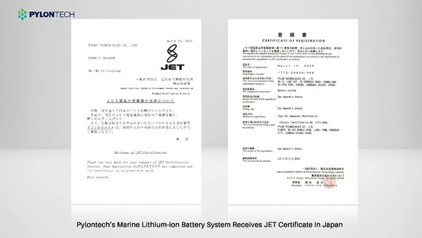 SHANGHAI, March 23, 2023 /PRNewswire/ — On March 10, 2023, Pylon Technologies Co., Ltd. (“Pylontech”) (Stock No. 688063) announced that its marine lithium-ion battery system received JET certificate in Japan. This certificate, issued on the basis of JIS C 8715-2: 2019, is another sign of recognition to Pylontech in Japanese market after the receipt of JET certificate of 37Ah single battery cell (model: 37PN) and S-Mark of Force H2 energy storage system.