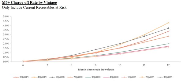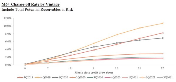 The following charts display the “vintage charge-off rate.” Total potential receivables at risk vintage charge-off rate refers to, with respect to on- and off-balance sheet transactions facilitated under the loan book business during a specified time period, the total potential outstanding principal balance of the transactions that are delinquent for more than 180 days up to twelve months after origination, divided by the total initial principal of the transactions facilitated in such vintage. Delinquencies may increase or decrease after such 12-month period.