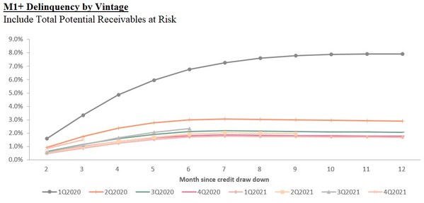 Total potential receivables at risk M1+ delinquency rate by vintage refers to, with respect to on- and off-balance sheet transactions facilitated under the loan book business during a specified time period, the total potential outstanding principal balance of the transactions that are delinquent for more than 30 days up to twelve months after origination, divided by the total initial principal of the transactions facilitated in such vintage. Delinquencies may increase or decrease after such 12-month period.