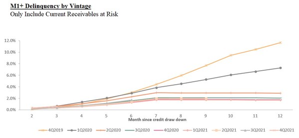 Current receivables at risk M1+ delinquency rate by vintage refers to, with respect to on- and off-balance sheet transactions facilitated under the loan book business during a specified time period, the actual outstanding principal balance of the transactions that are delinquent for more than 30 days up to twelve months after origination, divided by the total initial principal of the transactions facilitated in such vintage. Delinquencies may increase or decrease after such 12-month period.