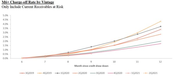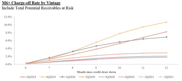 The following charts display the “vintage charge-off rate.” Total potential receivables at risk vintage charge-off rate refers to, with respect to on- and off-balance sheet transactions facilitated under the loan book business during a specified time period, the total potential outstanding principal balance of the transactions that are delinquent for more than 180 days up to twelve months after origination, divided by the total initial principal of the transactions facilitated in such vintage. Delinquencies may increase or decrease after such 12-month period.