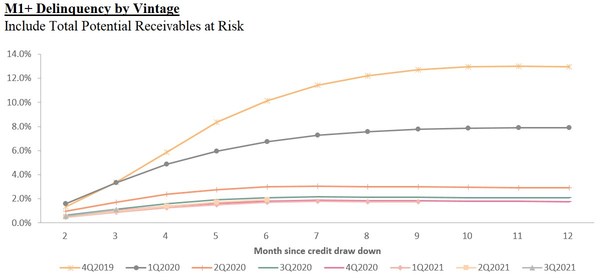 Total potential receivables at risk M1+ delinquency rate by vintage refers to, with respect to on- and off-balance sheet transactions facilitated under the loan book business during a specified time period, the total potential outstanding principal balance of the transactions that are delinquent for more than 30 days up to twelve months after origination, divided by the total initial principal of the transactions facilitated in such vintage. Delinquencies may increase or decrease after such 12-month period.