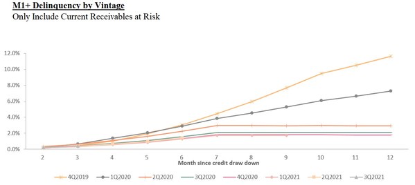 Current receivables at risk M1+ delinquency rate by vintage refers to, with respect to on- and off-balance sheet transactions facilitated under the loan book business during a specified time period, the actual outstanding principal balance of the transactions that are delinquent for more than 30 days up to twelve months after origination, divided by the total initial principal of the transactions facilitated in such vintage. Delinquencies may increase or decrease after such 12-month period.