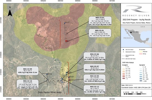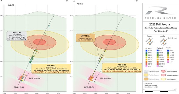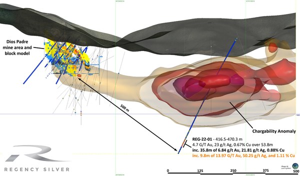 VANCOUVER, BC, Oct. 12, 2022 /PRNewswire/ — Regency Silver Corp. (“Regency Silver” or the “Company”) (TSXV: RSMX) (OTCQB: RSMXF) is pleased to announce that its initial drill hole into a pronounced Induced Polarization (IP) anomaly 500 m north of the historic Dios Padre silver mine workings intercepted 4.7 g/t gold over 53.8 metres. The intercept included 35.8 metres of 6.84 g/t gold, 0.88% copper and 21.82 g/t silver, starting at 420 m depth down hole along with 13.97 g/t Au, 50.25 g/t Ag and 1.11 % Cu over 9.8 m starting at 460.5m down hole. The hole ended in mineralization and was stopped due to the 500 metre maximum capacity of the drill rig being used.