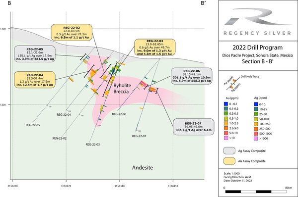 Additional drilling outside of the existing block model near the old silver mine workings intercepted grades as high as 582.47 g/t silver over 3.9 m from 21.1 m to 25 m depth in hole REG-22-05, 558.30 g/t silver over 5.85 m from 38.15 m to 44 m in hole REG-22-06 and 420.23 g/t silver over 3.10 m in hole REG-22-09. The old silver mine workings contain an existing NI 43-101 inferred resource of 9.5 million ounces of silver equivalent with an average silver grade of 236 g/t.(1.25 million tonnes at a grade of 236 g/t Ag Eq ). Regency is very encouraged that the step-outs all indicate that the system continues both to the east and the west where it was previously thought to have stopped and currently sees no impediment to continued lateral expansion of the deposit along strike to the east and the west. Additionally, to the east, gold values of the easternmost holes are some of the strongest intersected in the mine area with hole REG-22-04 intersecting 17.9 m of 1.34 g/t Au. The results indicate a more gold rich zonation in the system towards the east.