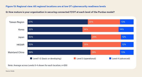 Telstra International commissioned technology research company Omdia to evaluate the state of OT and IT convergence in North Asia, assessing maturity, benefits and opportunities. The study of 250 business and technology leaders in the mainland China, Hong Kong, Japan, Korea and Taiwan region, found only 13 per cent of businesses are at an advanced level of readiness to deal with IT/OT security, with most businesses (60 per cent) only at basic level.