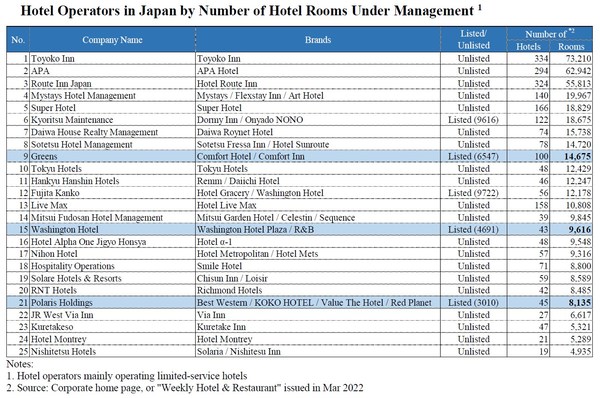 TOKYO, Aug. 3, 2022 /PRNewswire/ — Star Asia Group and its affiliates (“Star Asia Group”) announced today that it has made a strategic investment in two listed Japanese hotel operating companies, Greens Co. (TSE: 6547) and Washington Hotel Corp (TSE: 4691). Star Asia Group also currently owns over 76% of Polaris Holdings Ltd (TSE: 3010) which is the owner and/or operator of 45 hotels with 8,135 rooms across Japan and the Philippines. Polaris has opportunistically grown its rooms under operation by 2.62x over the last 2 years and is looking to further grow through additional accretive hotel acquisitions as well as corporate M&A.