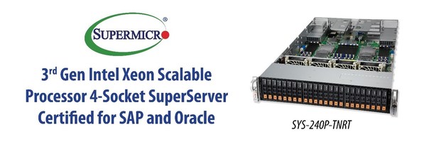 SAN JOSE, Calif., Dec. 3, 2020 /PRNewswire/ — Super Micro Computer, Inc. (Nasdaq: SMCI), a global leader in enterprise computing, storage, networking solutions and green computing technology, today announced that its 4-socket server platform, powered by advanced 3rd Gen Intel Xeon Scalable processors with built-in AI acceleration, is now certified for SAP HANA as well as Oracle Linux and virtualization. Shipping in volume, the 2U 4-socket server, combined with advanced enterprise software, enables customers to leverage the value, benefit, and simplicity of these turn-key solutions for computationally intensive SAP and Oracle workloads.
