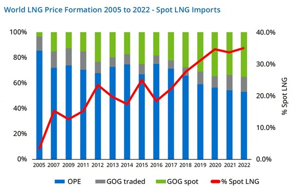 The share of spot LNG in the market rose back to 35%, following a small decline in 2021. The total GOG share of LNG imports reached 47% of all LNG trade in 2022, nearly doubling since 2016 when it was at 25%.