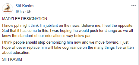“I know people might think I’m jubilant on the news. Believe me, I feel the opposite. Sad that it has come to this. I was hoping, he would push for change as we all know the standard of our education is way below par.