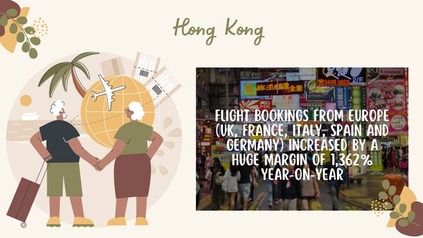 Trip.com data shows global hotel bookings for arrivals between 15 March to 30 June increased year-on-year by 13% from 2022 to 2023). Flight bookings from Europe (UK, France, Italy, Spain and Germany) increased by a huge margin of 1,362% year-on-year from 2022 to 2023, for arrivals between 15 March to 30 June. The most popular flight route was from the UK – Hong Kong, followed by GermanyHong Kong, and the top five destinations for tourists were mainland China, Singapore, the UK, America and Canada.