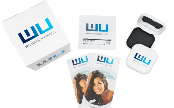 An example suite of custom logo items for patient aligner cases manufactured by uLab Systems for Wu Orthodontics.