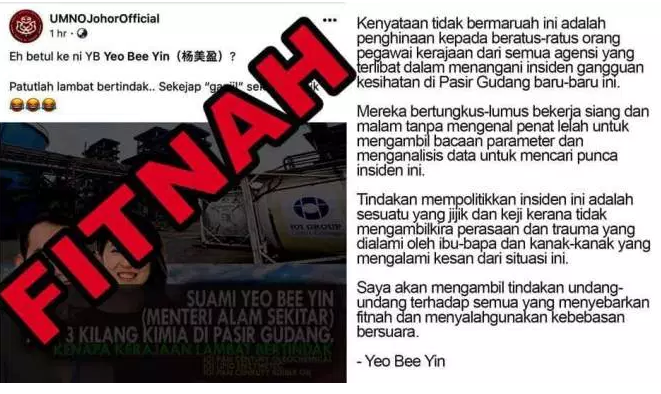 In a statement on her Facebook, Yeo said that allegations against her family was an insult to the hundreds of civil servants from various agencies working hard to find out what is causing the pollution in Pasir Gudang.