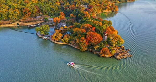 Autumn in Yuantouzhu is colorful and vibrant. The clouds are pure white, sunshine bright and warm, and wind gentle and soft at this time of year. Visitors can easily feast their eyes on the picturesque scene of the Taihu Lake glittering in the golden light of the setting sun, while the sparkling lake surface is dotted with sails in the distance. In late autumn, hills in the scenic spot are beautifully embellished with bright red foliage, and leaves flutter in the wind like butterflies. The poetic sight gladdens the heart and pleases the eye.
